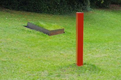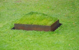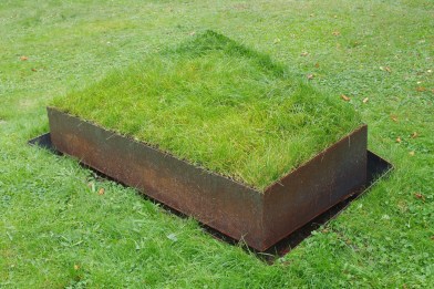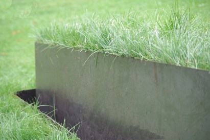 In dieser abstakten, reduzierten Formensprache kann das Kunstwerk nichts anders als sich selbst bedeuten. Der artifizielle Charakter der Arbeit ergibt sich durch das harte Material mit seiner konsequenten Linienführung und die Weichheit und Unregelmäßigkeit des Grases.